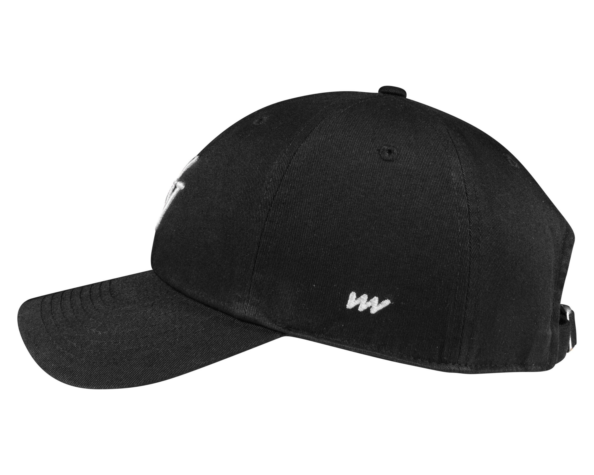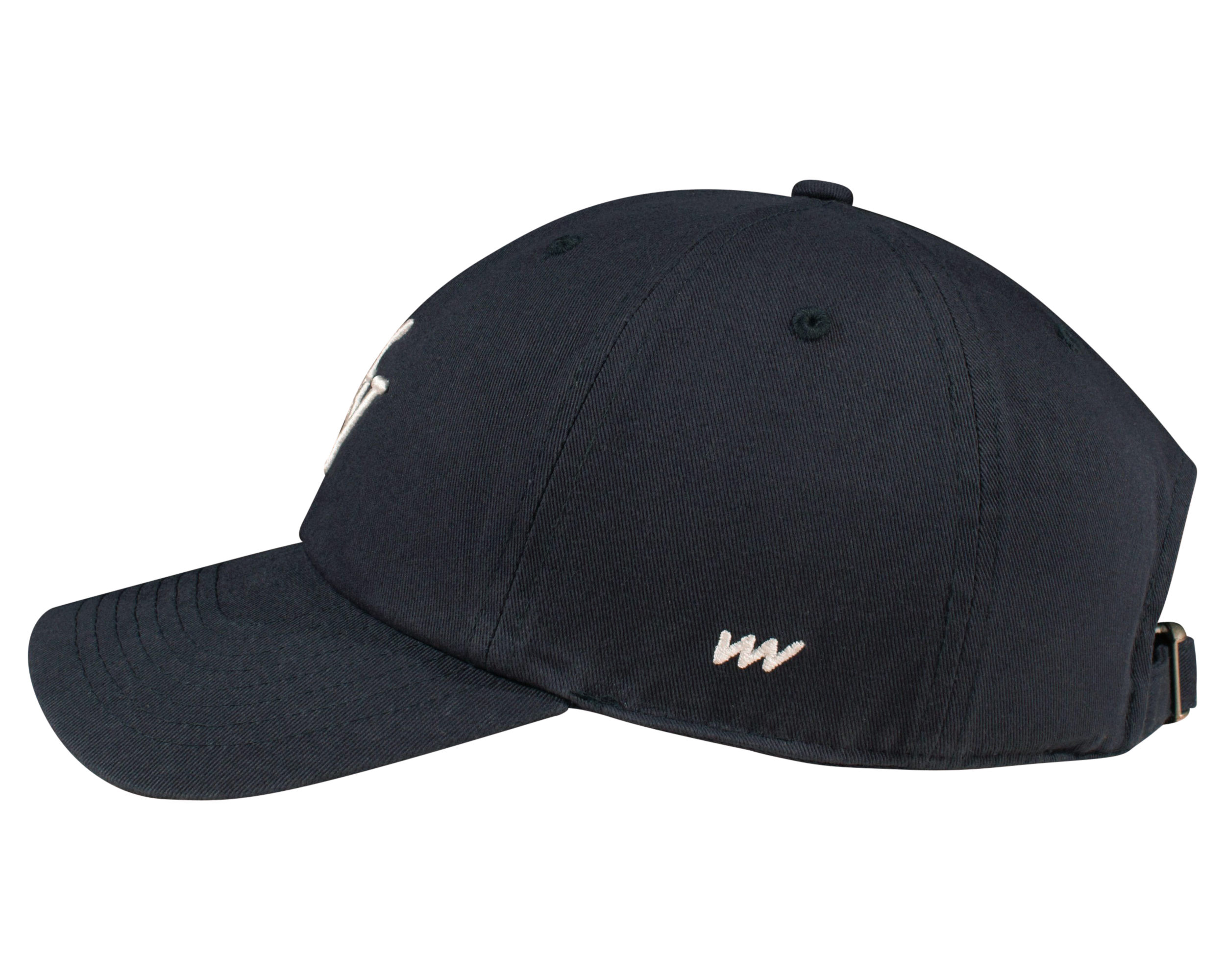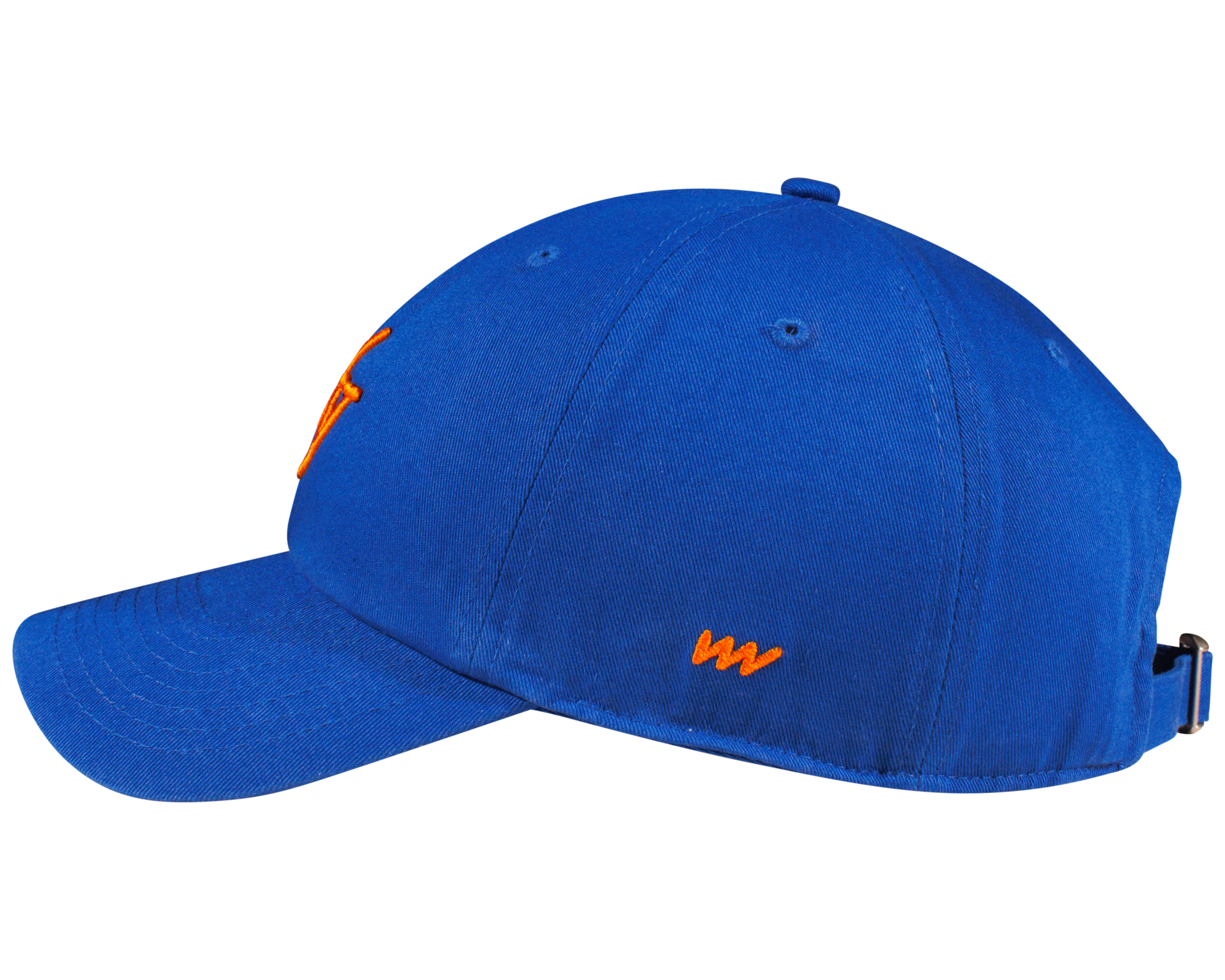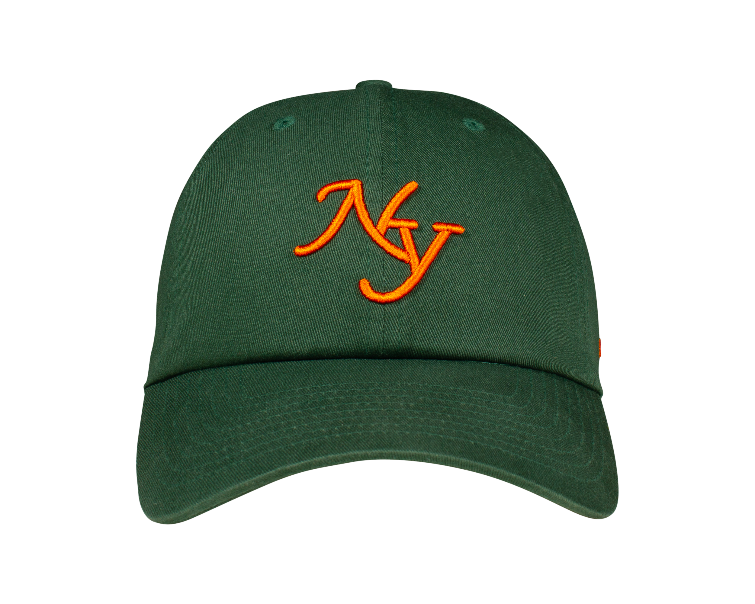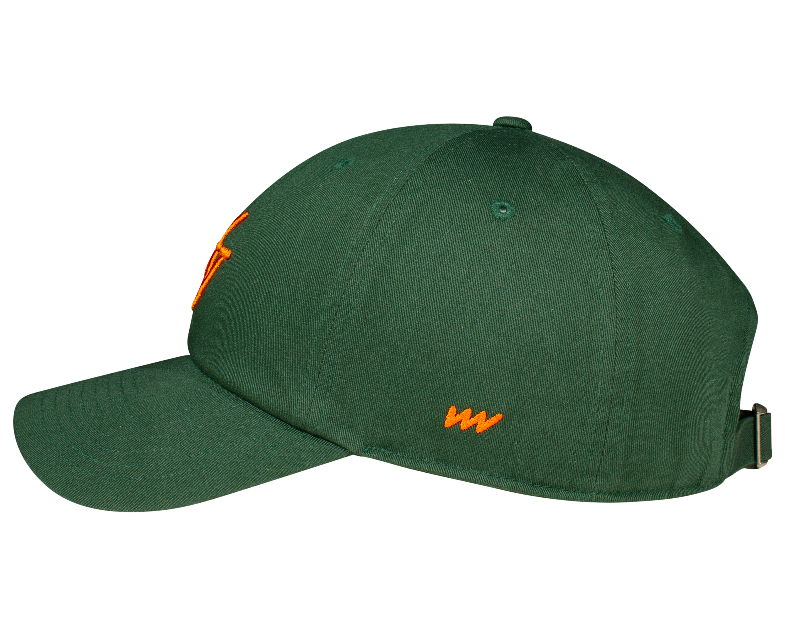 green unstructured 6 panel hat with orange embroidery and adjustable strap with silver metal buckle. 100% cotton
