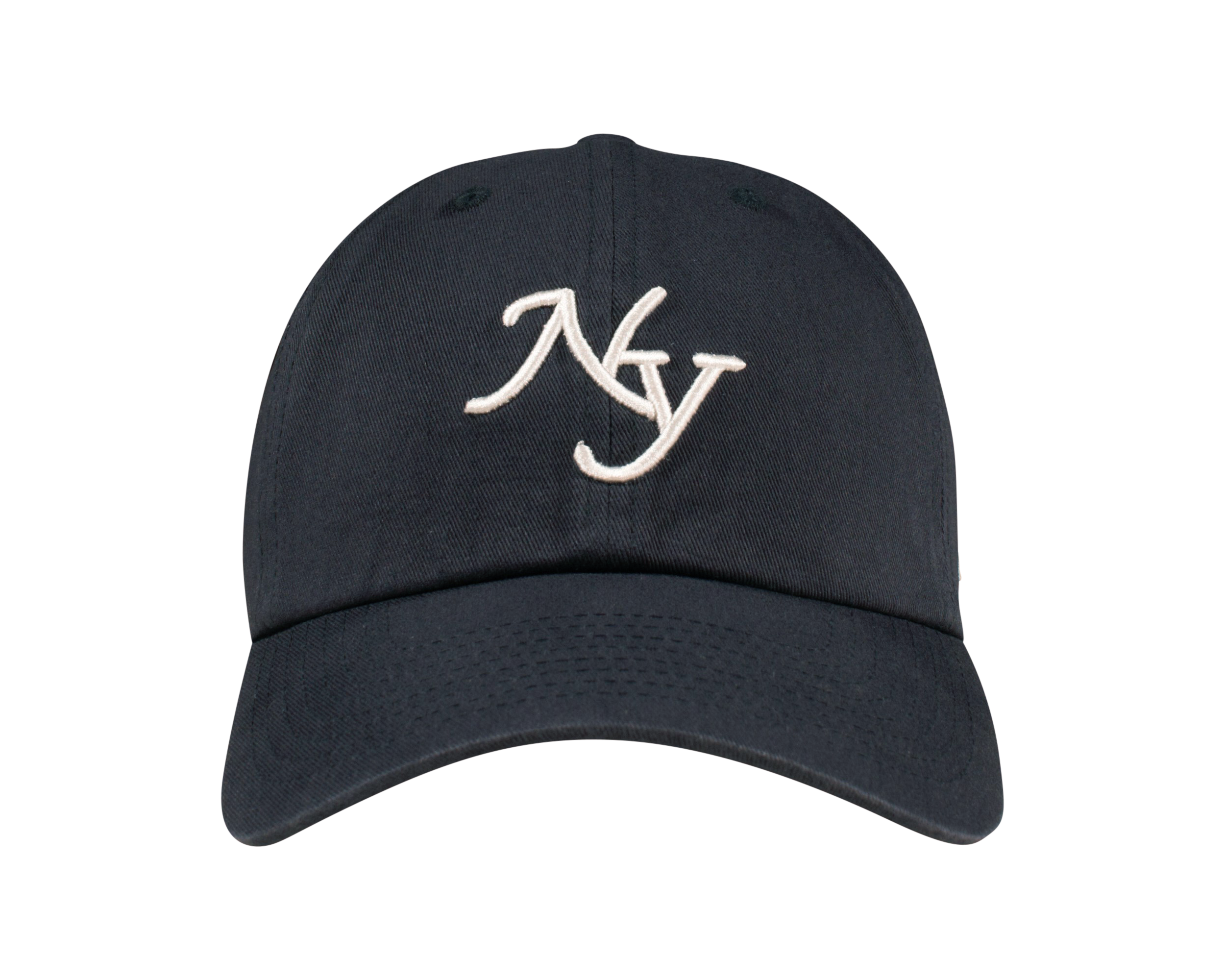 navy blue unstructured 6 panel hat with white embroidery and adjustable strap with silver metal buckle. 100% cotton